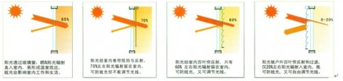 1之間,S值越小,進入室內熱量越少,遮陽效果越顯著,消耗能量就越小。公用建筑或民用住宅如采用內遮陽措施,僅能減少空調能耗的8~10%,而采用外遮陽百葉簾,則可減少空調能耗的30~40%,節能效果顯著。S值與遮陽系統的安裝位置及結構形式相關,見圖1: