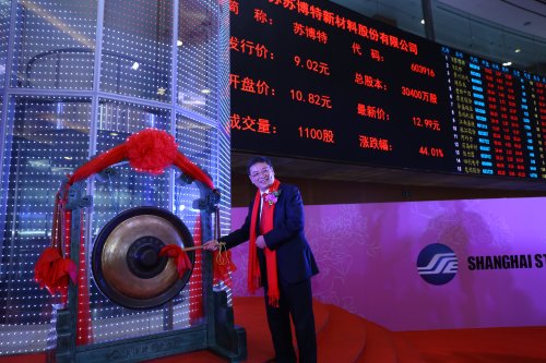 天朗氣清送祝福,秋色宜人報喜訊。2017年11月10日上午,江蘇蘇博特新材料股份有限公司上市儀式于上海證券交易所成功舉行!這是蘇博特發展的又一個里程碑,公司將在新的起點上揚帆再出發,開啟發展新征程! 蘇博特首次公開發行股票數量為7,600萬股,股票簡稱為“蘇博特”,股票代碼為“603916”,本次發行的主承銷商為中國國際金融股份有限公司。在上市儀式上,蘇博特公司董事長繆昌文院士致辭,對關心、支持蘇博特發展的各級領導和各界朋友表示感謝,他表示,上市后公司將借助資本市場的力量,堅持技術創新、提高核心競爭力,在高速成長的行業環境中實現再一次騰飛。同時,公司將嚴格按照上市規則要求,保持公司的透明度和良好的公司治理結構,用好募集資金,規范公司運作,推動公司持續、健康發展!中金公司董事會秘書吳波隨后致辭,他表示將一如既往地履行保薦職責,勤勉盡職,關注和支持蘇博特的發展,攜手共進、互惠共贏。江蘇省副省長藍紹敏出席上市儀式并致辭,藍省長對蘇博特的成功上市表示熱烈祝賀,對蘇博特雄厚的科研實力和取得的成績表示肯定,希望蘇博特充分發揮資本優勢,進一步提升核心競爭力,抓住機遇再攀高峰,以一流的業績回報社會和廣大投資者。