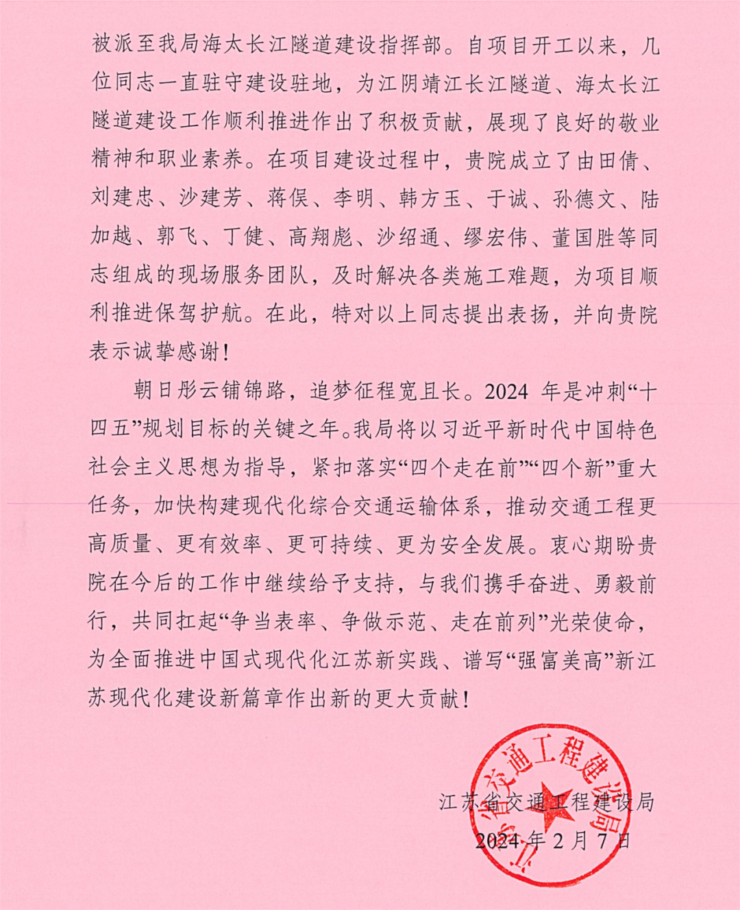 近年來,我院為江陰靖江長江隧道、海太長江隧道等重點工程取得重大進展付出了諸多努力,在龍年春節來臨之際,江蘇省交通工程建設局特別致信,對我院的全力支持表示感謝。